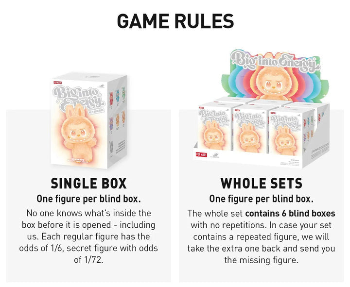 The Pop Mart Labubu Big into Energy Blind Box - Energize your collection with the Pop Mart Labubu 'Big into Energy' series. Each blind box contains one randomly selected Labubu figure, standing approximately 17 cm tall.These vinyl plush pendants showcase vibrant tie-dye designs representing themes like Love, Luck, and Serenity. Every unboxing is a delightful surprise, with a chance to discover the rare secret edition.Crafted from high-quality PVC and polyester, these figures are perfect for collectors seeking a burst of color and charm.