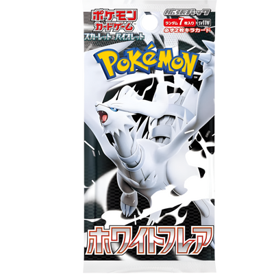 The Pokémon TCG: Scarlet & Violet – White Flare Booster Pack (Japanese) contains 7 cards. Key chase hits include Reshiram ex (Black White Rare), Reshiram ex (Special Illustration Rare), Hilda (Special Illustration Rare), Hydreigon ex (Special Illustration Rare), and Keldeo ex (Special Illustration Rare)—high-value pulls that collectors are hunting for.