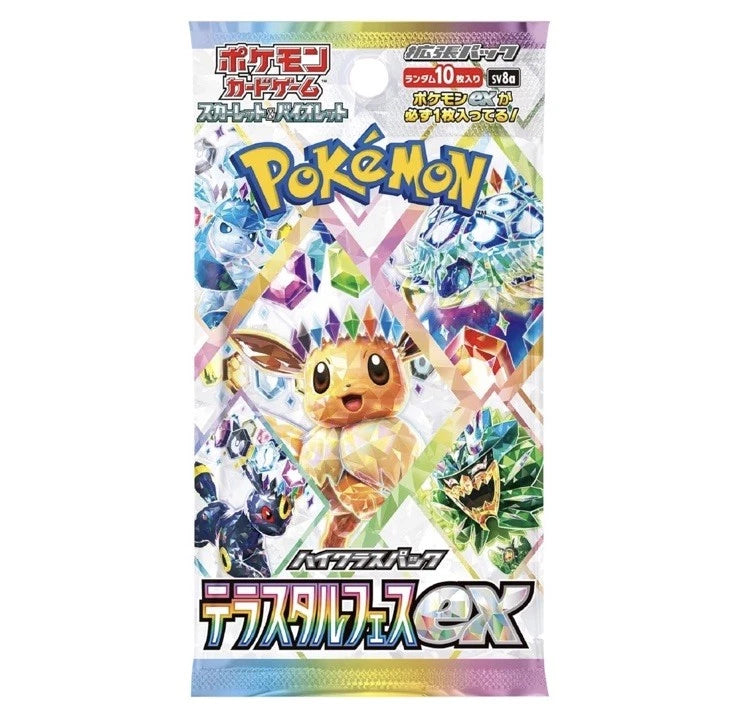 The Pokémon TCG: Terastal Festival Booster Pack (Japanese) contains 10 cards. Each pack presents a dazzling chance to pull crystal-hatted Eeveelutions like Umbreon ex (SIR), Sylveon ex (SIR), or even rare Master Ball reverse holograms—perfect for Eevee fans and foil collectors alike.