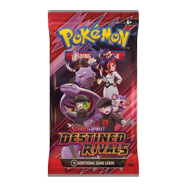 The Pokémon TCG: Scarlet & Violet – Destined Rivals Booster Pack contains 10 cards + 1 Basic Energy. Key chase hits include Team Rocket’s Mewtwo ex SIR, Cynthia’s Garchomp ex SIR, and Ethan’s Ho-Oh ex SIR—premium pulls for serious collectors.