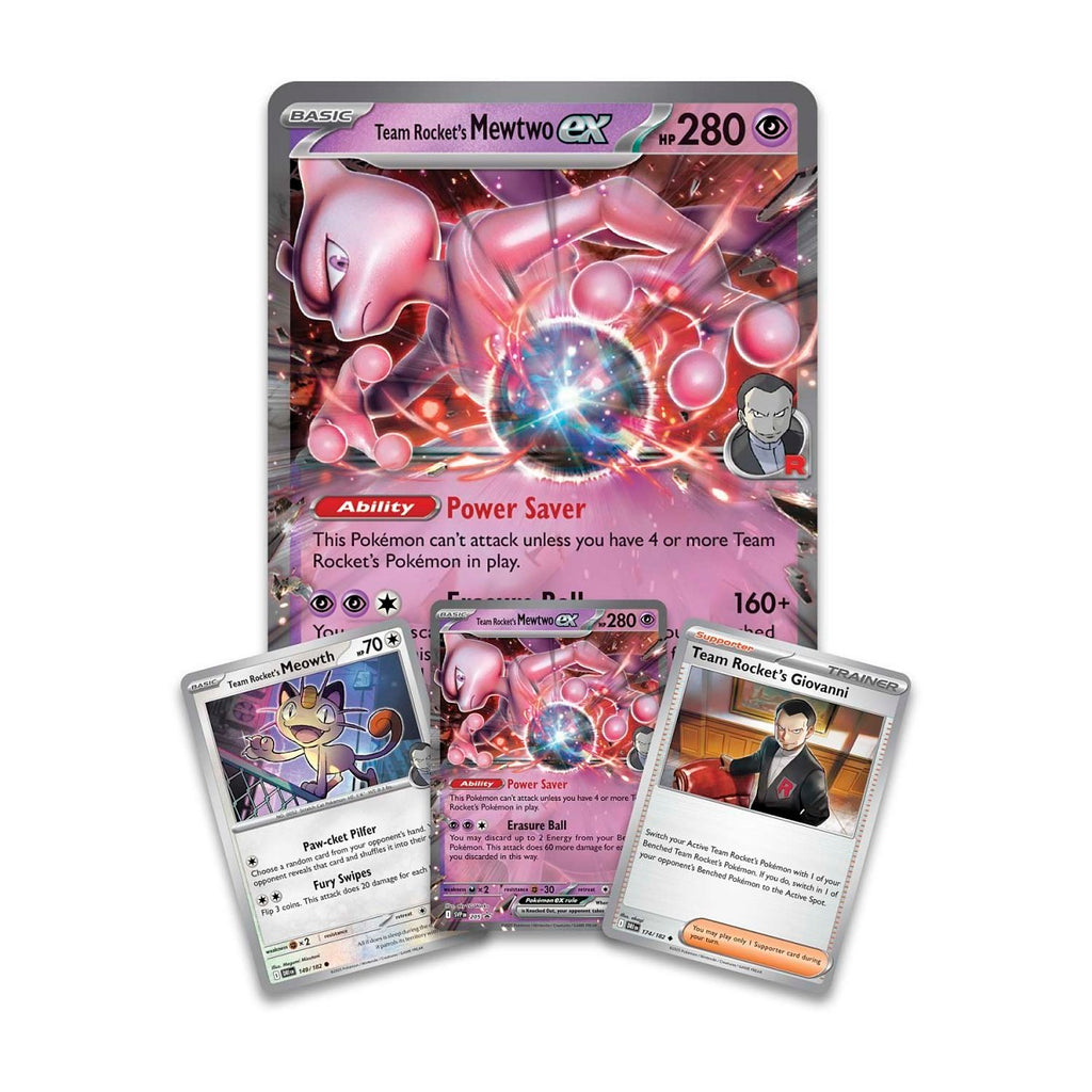 The Pokémon TCG: Team Rocket’s Mewtwo ex Box contains 4 booster packs, 1 foil promo card featuring Team Rocket’s Mewtwo ex, 2 foil promo cards (Team Rocket’s Meowth and Giovanni), 1 oversize foil Mewtwo ex, and a photo sticker. A compact bundle with high collector appeal and guaranteed exclusive artwork.