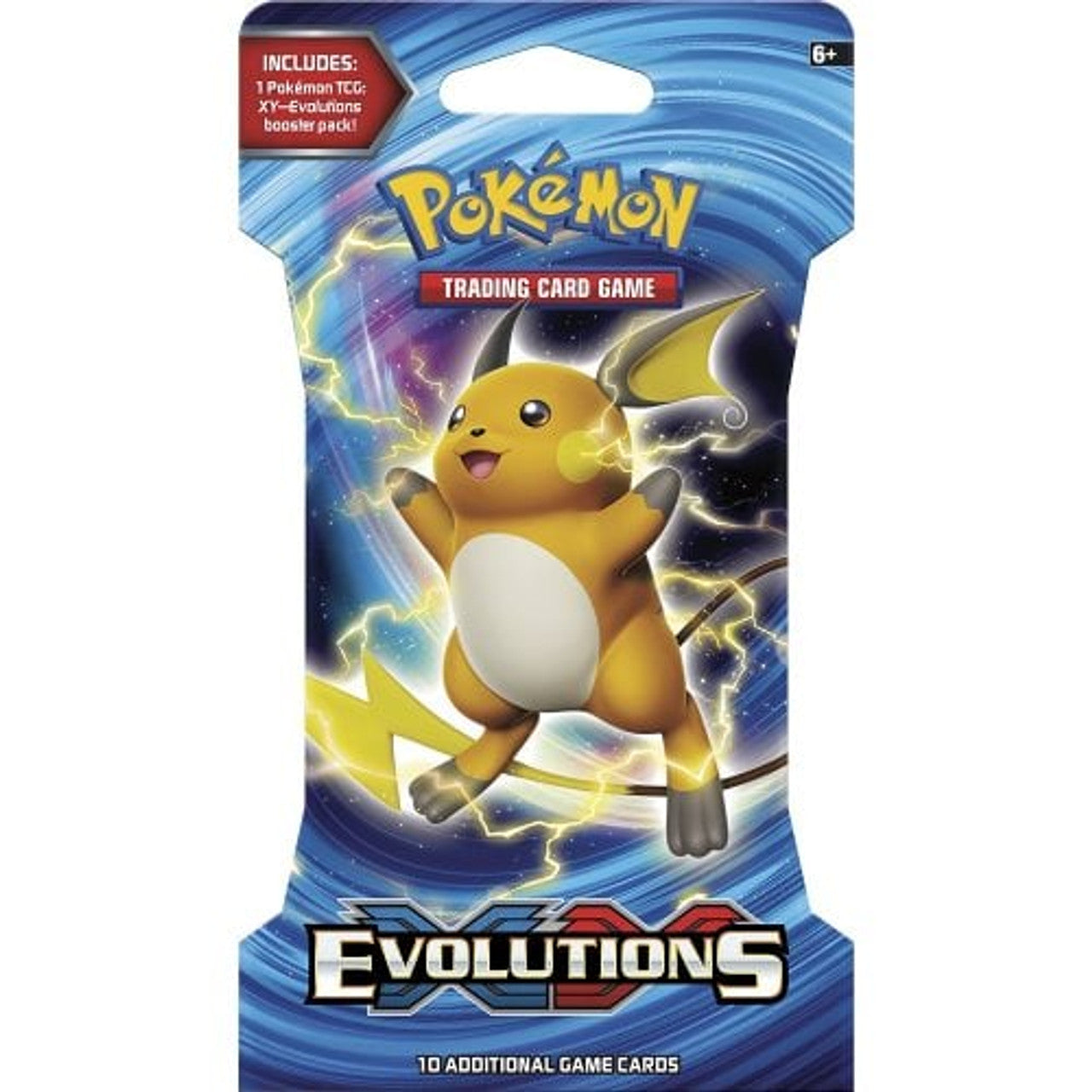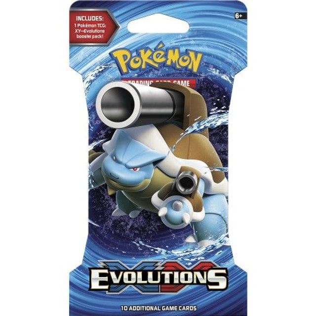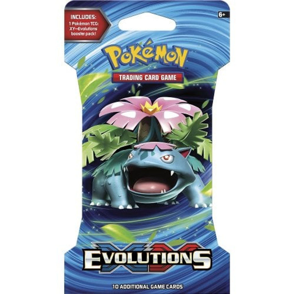 Booster pack from XY Evolutions with additional cardboard packaging, each booster pack contains 10 Pokemon trading cards and a code card for the trading card game online.